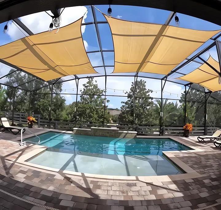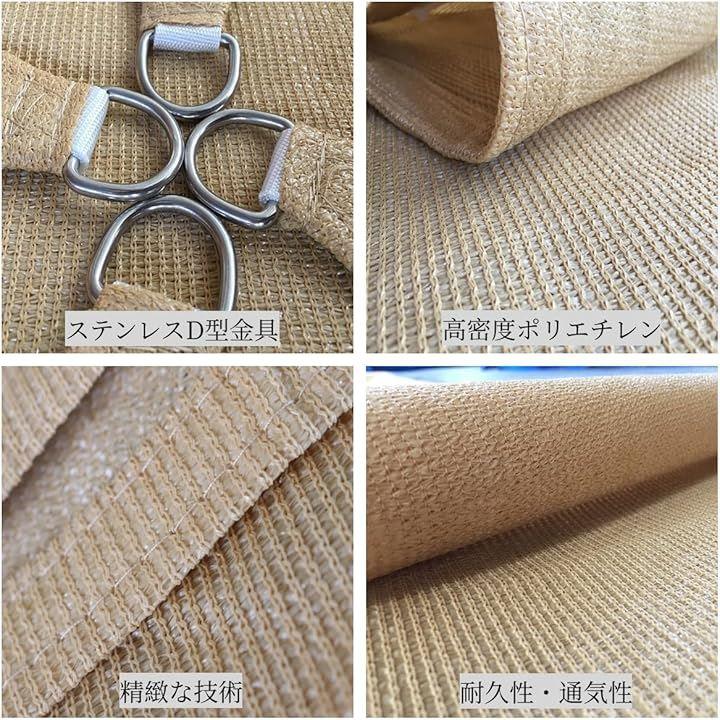 *仕様* 素材:185GSM高密度ポリエチレン(全新HDPE); カラー:ベージュ; パッケージ内容:(三角形)日除けシェードx1;ロープx3;金具x3;(四角形)日除けシェードx1;ロープx4;金具x4
