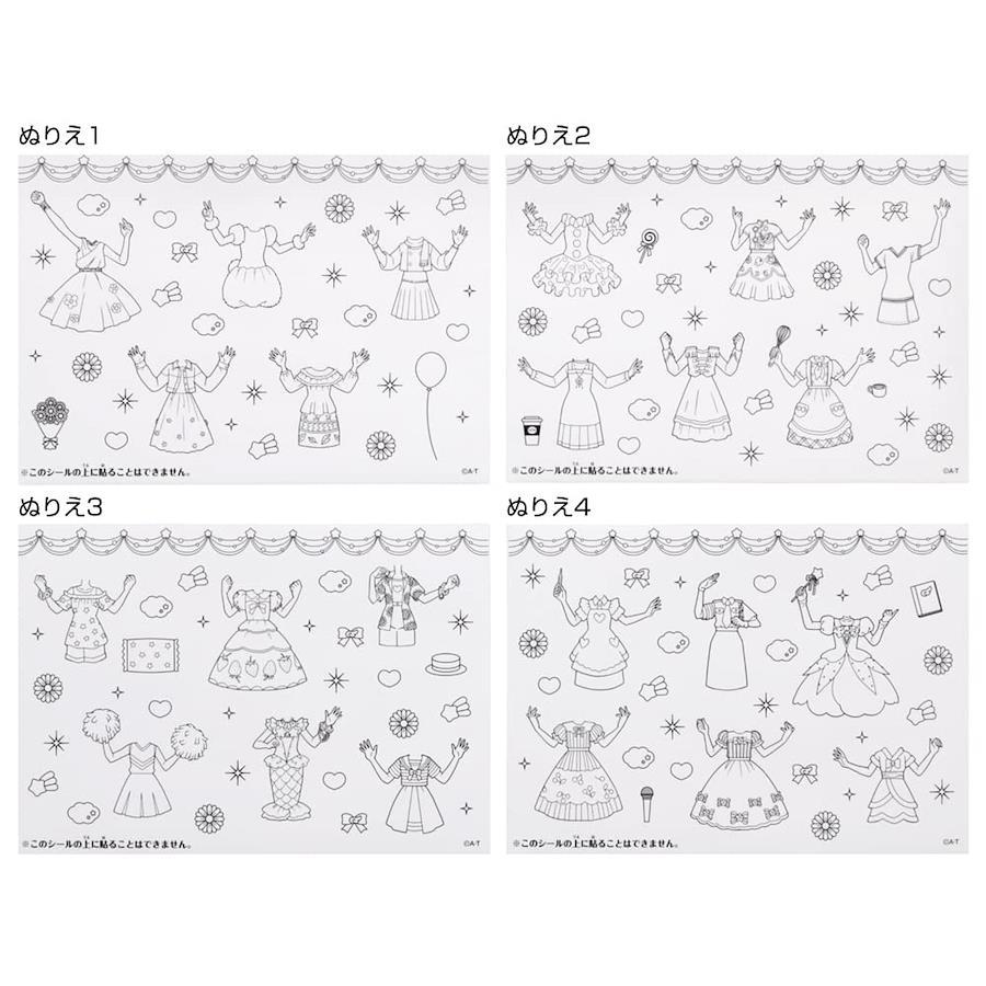 きせかえシールとぬりえシールできせかえあそびができるセットです。350ピース以上のシールが入っています。トランクにシールをしまっておくことができます。トランクのフタの裏はステージになっています。シールをはってごっこあそびができます。ぬりえシートに色を塗って、好きな色の洋服にできます。