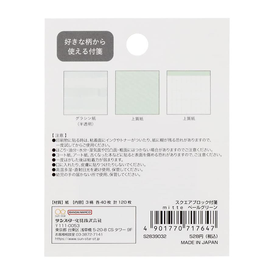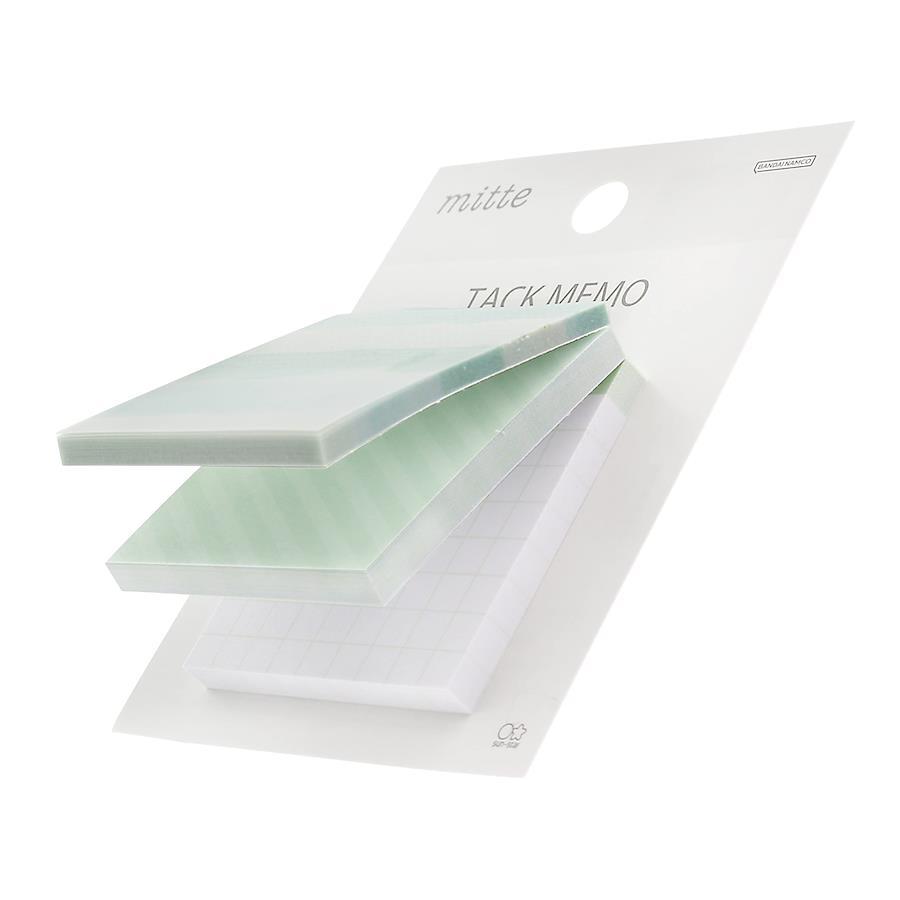 「魅せる」コンセプト見える文具スクエアブロック付箋 mitteスクエア型なのでたくさんメモしたり絵を描ける、「スクエアブロック付箋 mitte」。 デザインは、ペールグリーン。1柄目は透け感のあるグラシン紙。同じカラーで揃えてかわいい!「魅せる」コンセプトのステーショナリーシリーズに春らしい爽やかな新色が登場しました。