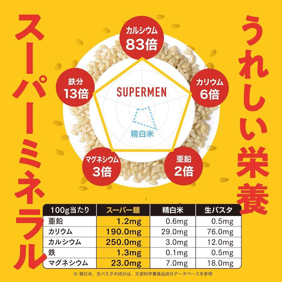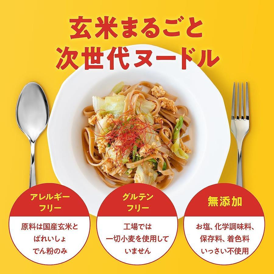 ?【原材料】:国産玄米粉(宮城県産 ササニシキの玄米を焙煎)、馬鈴薯でんぷん粉(北海道産) 【内容量】1食あたり100g 【ゆで時間】90秒。あっという間に美味しく茹で上がります。 【保存方法】常温保存 【賞味期限】製造から1年?国産玄米のグルテンフリーパスタ。生産工場でも小麦使用が一切なし。米粉麺の専用工場で、玄米粉の焙煎・製粉から、製麺、パッケージング、過熱殺菌までを一貫生産していますので、コンタミネーションの心配もありません。(特定28品目 不使用)?生麺食感!独自製法で、今までになかった生麺パスタのような食感を実現。美味しく、のびにくいコシが評判です。平打ち麺の幅はもっちり食感が強く感じられる[ 7mm ]?化学調味料、保存料、着色料をはじめとした添加物は不使用で塩も無添加。玄米由来の栄養素も含むヘルシーヌードルです。?ゆで時間はたったの90秒と短く、ラーメン・パスタ・うどん風にも調理ができる万能グルテンフリー麺。しかも常温保存可能で、賞味期限は製造から1年。備蓄や非常食・保存食にもおすすめです。?栄養成分表示:1食100gあたり エネルギー 243kcal/たんぱく質 3.3g/脂質 0.2g/炭水化物 57.0g -糖質 55.2g -食物繊維 1.8g/食塩相当量 0g/亜鉛 1.2mg/カリウム 190.0mg/鉄 1.3mg/マグネシウム 23.0mg【重要】メーカーによる商品リニューアルに伴いパッケージ(内容量も含む)変更が行われた場合、新パッケージでお届け致します事ご了承願います。