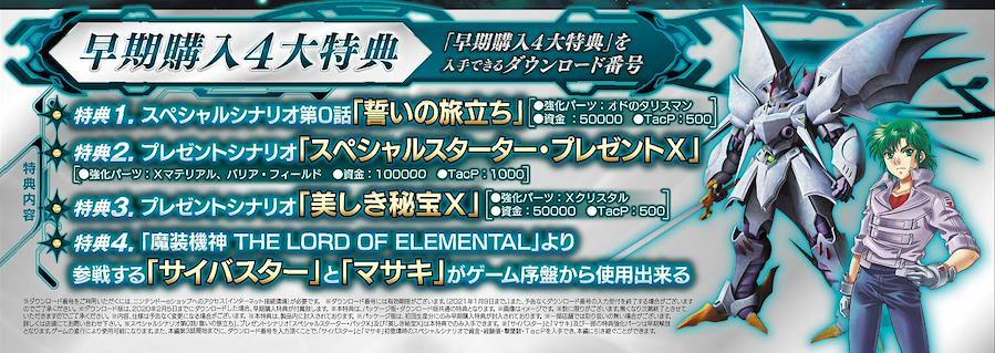 【早期購入特典】スーパーロボット大戦X「早期購入4大特典」を入手できるダウンロード番号【特典1】スペシャルシナリオ第0話「誓いの旅立ち」【特典2】プレゼントシナリオ「スペシャルスターター・プレゼントX」【特典3】プレゼントシナリオ「美しき秘宝X」【特典4】「魔装機神 THE LORD OF ELEMENTAL」より参戦する「サイバスター」と「マサキ」がゲーム序盤から使用出来る