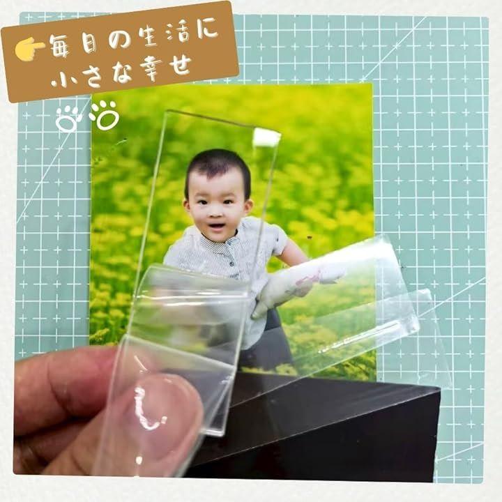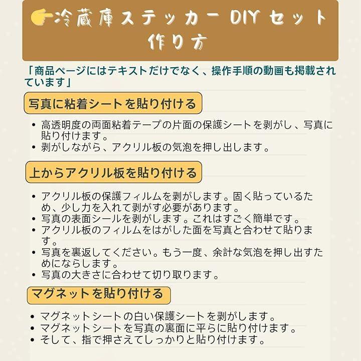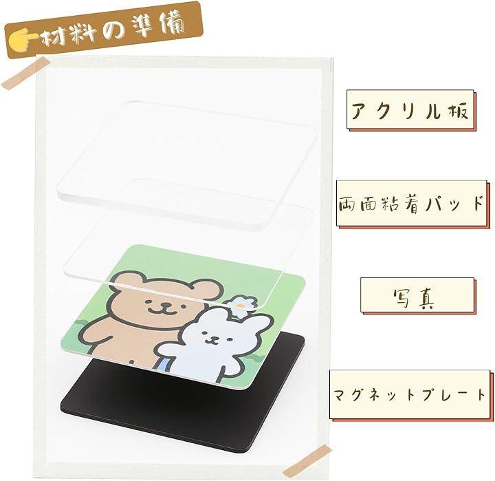 「作り方」上から下への貼り付け順序は次の通りです:超透明アクリル板、透明両面粘着パッド、写真(ご自身でご用意ください)、マグネットプレート。
