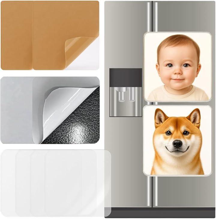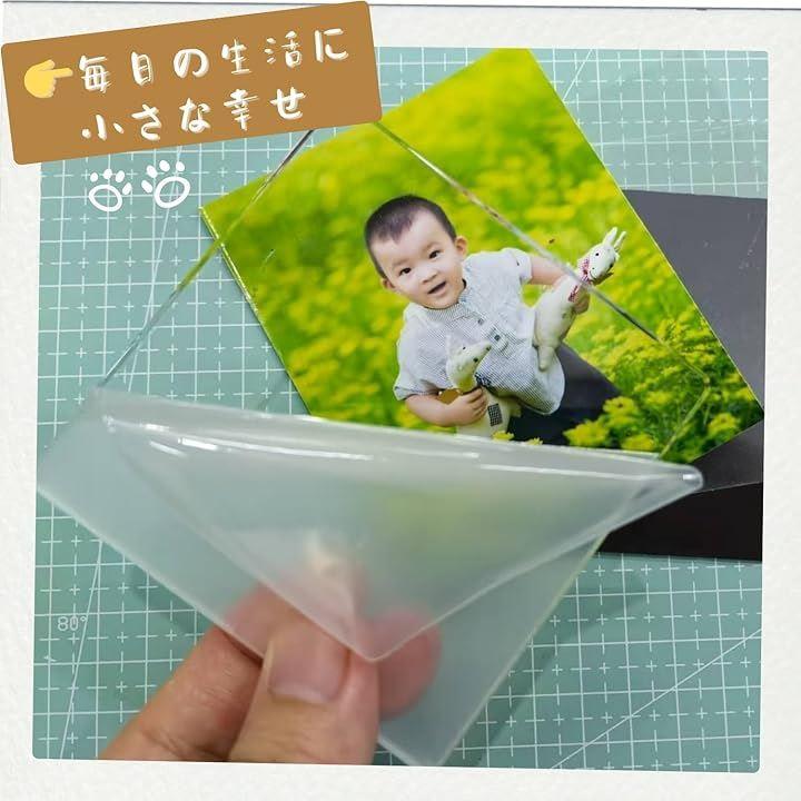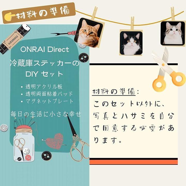「作り方」上から下への貼り付け順序は次の通りです:超透明アクリル板、透明両面粘着パッド、写真(ご自身でご用意ください)、マグネットプレート。