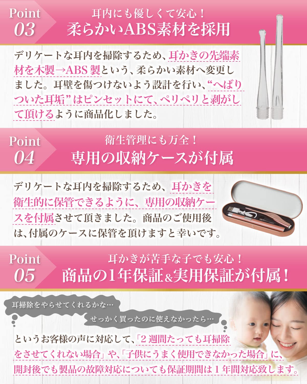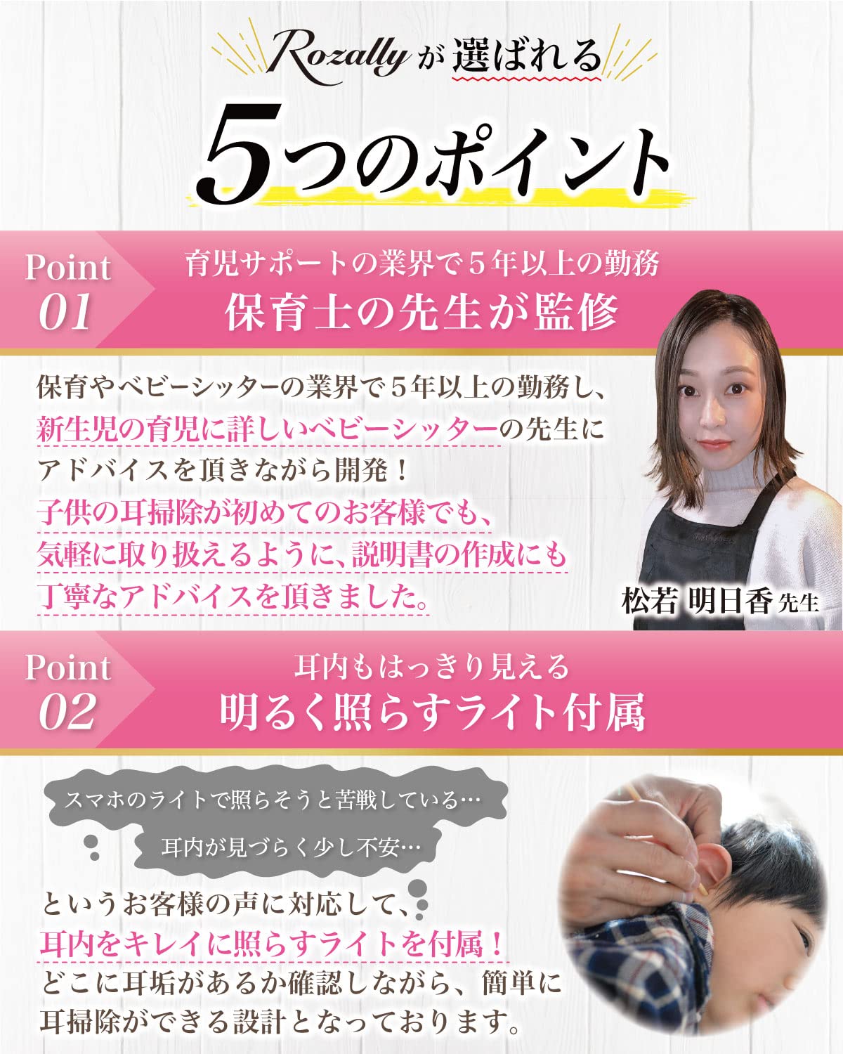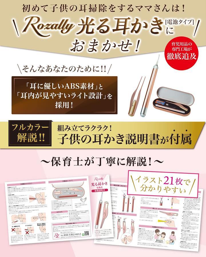 【保育士が監修】 Rozally 耳かき セット 電池ver がついに正式販売開始。 子供 の 耳垢 掃除 のために みみかき と ピンセット が欲しい…というお客様に人気の “先端部が 光る耳かき ”です。 子供 や 赤ちゃん の 耳掃除 では耳穴が暗くて見えにくい…というお声が多く、照明付き の先端部が 光る 設計にすることで 耳 を ライト で照らして 耳掃除 がラクラクできる仕様に改良致しました。 企画&設計では 耳かき や 子育て 全般に に詳しい【保育士&ベビーシッター】の先生からアドバイスをもらい、 子供用 の 耳垢掃除 や 定期的な 耳かき の 方法 など色々な使用方法を説明書として添えて企画&開発しました。 【こだわり】様々なメーカーから 子ども用 の みみかき 用品として” 耳掃除セット ”や” 光る耳かき + ピンセット ”が販売されていますが、Rozallyの 耳かき セット 電池ver は”こだわり”が一味違います。 照明付き耳かき や 照明付きピンセット など 育児&子育てアイテムをメインに取り扱っている10社以上の工場からサンプルを取り寄せ、「使いやすさ×安全性」を一緒に試行錯誤して頂けた1社に絞って発注を行なっています。 製造カラーについても かわいい 単色3カラーにて展開をさせて頂きました。「出産祝い」や「産後祝い」のプレゼントなどにもご愛用頂いております。 【フルカラー説明書が付属!】 本製品には安心して 耳掃除 して頂けるよう、商品の使用方法 はもちろん 耳かき ワンポイントアドバイス など丁寧に使用方法を解説させて頂きました。女性のお客様1人でも簡単に耳垢掃除ができるよう、イラスト21枚でフルカラー解説しています。 【製品の長期保証】 Rozally 耳かき セット 電池ver は品質にこだわり、工場と交渉をおこなって素材選定から進めています。出荷前の検品などは十分に行わせて頂いているのですが、輸送中に破損や汚れの付着など稀に発生してしまうケースがあります。不具合などが発生してしまった場合でも、製品には1年間の長期保証を付属させて頂いておりますので、すぐに交換品の手配をさせて頂きます。また本製品には上手く 耳掃除 をして頂くことを最優先に考え、「2週間ほど使用しても上手く使いこなせなかった」という場合に、”開封後”でも”使用済み”でも全額のメーカー返金保証を付属させて頂いております。