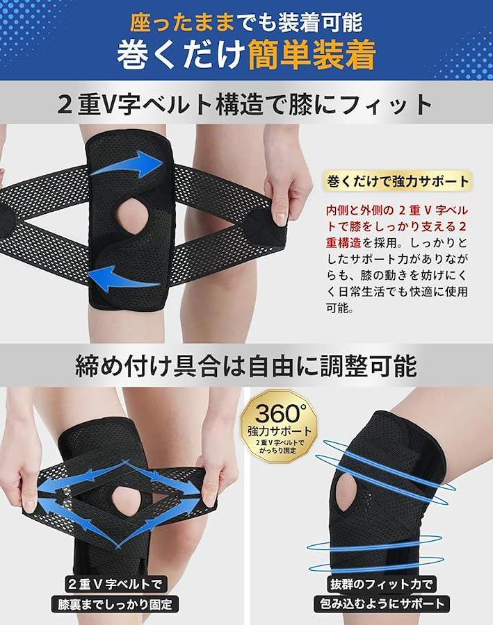 「整体師・理学療法士のW監修2重 V字サポート構造で快適なフィット感」 GOSEONの膝サポーターは、整体師・理学療法士の意見をもとに設計されたxx2重xxV字ベルト構造を採用。