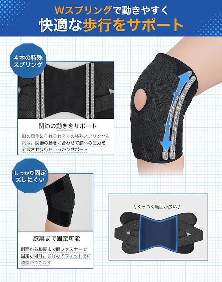 「特殊スプリングを両側に装備」 膝サポーターには、両サイドにそれぞれ2本の特殊スプリング内蔵されており動きに合わせてしっかりと動きをサポートしてくれます。