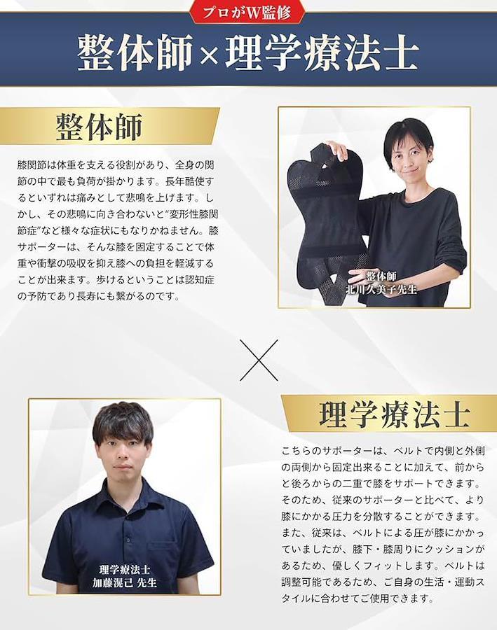 「整体師・理学療法士のW監修2重 V字サポート構造で快適なフィット感」 GOSEONの膝サポーターは、整体師・理学療法士の意見をもとに設計されたxx2重xxV字ベルト構造を採用。