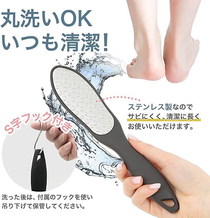 「丸洗いOK。いつも清潔」ステンレス製の角質やすりなのでサビにくく水洗いOK。清潔に長く使っていただけます。