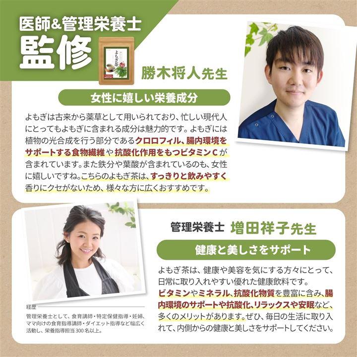 「医師&管理栄養士監修」よもぎには、現代人に不足しがちなビタミンA・C・Eなどのビタミン類、 鉄・カリウムなどのミネラル類、 そして食物繊維や葉酸等に富んでいます。