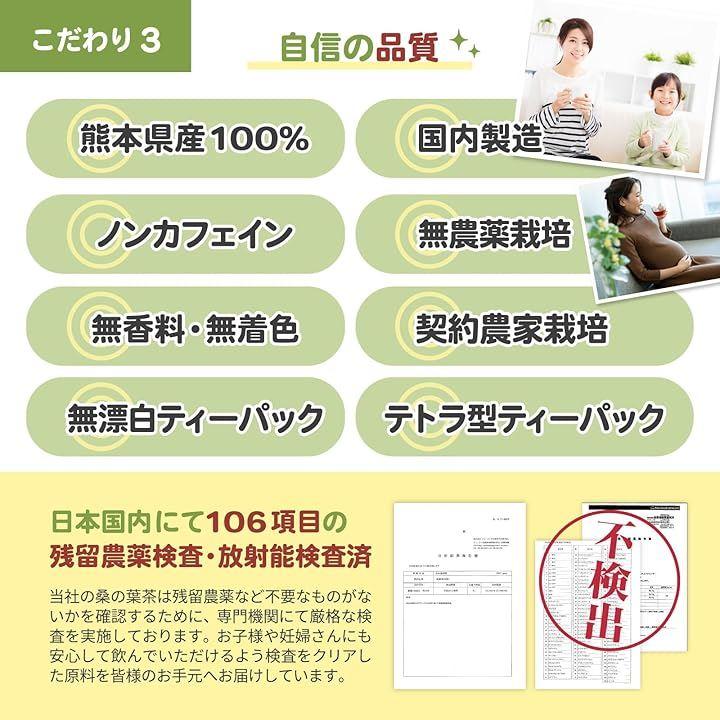 「熊本県産・国内製造」契約農家で厳選された熊本県産100%の桑の葉のみを使用し、日本国内で栽培から収穫、加工製造まで品質管理を徹底しています。