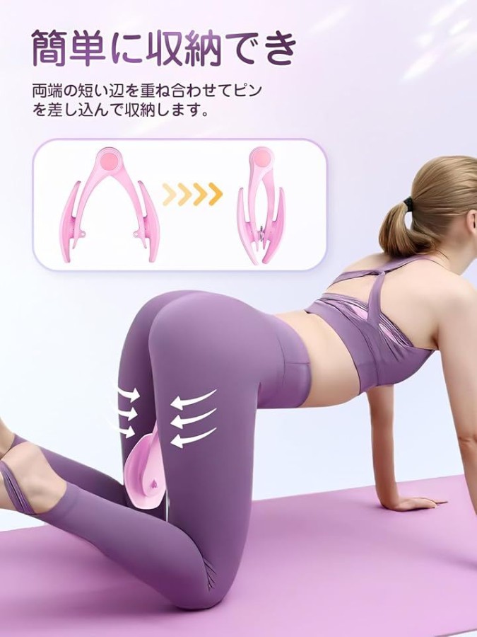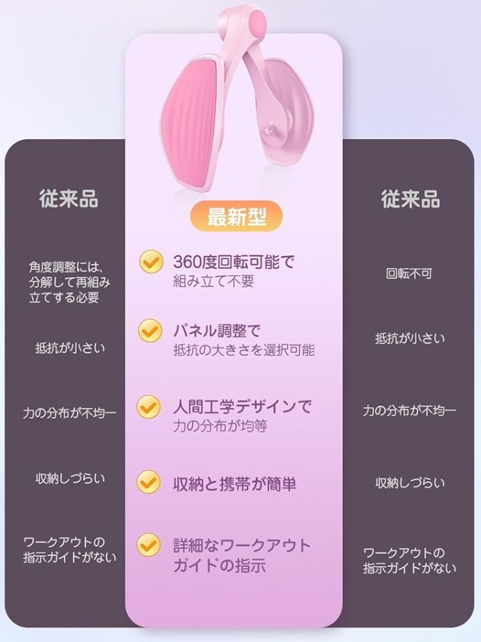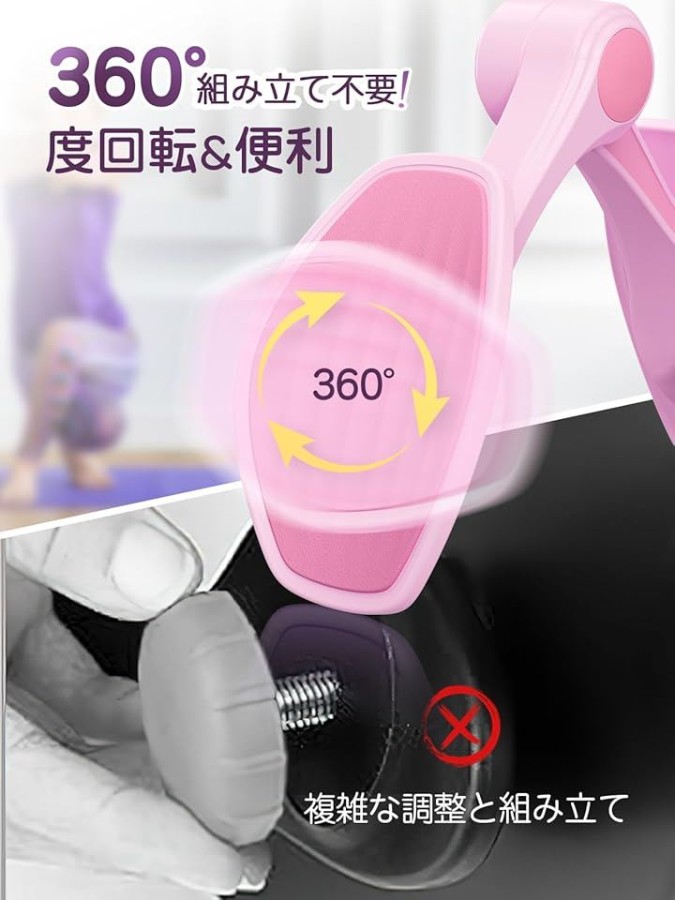 「組み立て不要の360°調整 内転筋トレーニング」この内転筋トレーニング器具は組み立て不要で360度回転するパネル設計を採用しており、すぐに筋トレを開始できます。