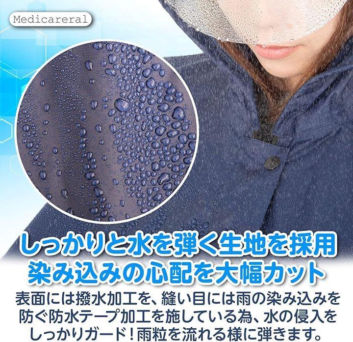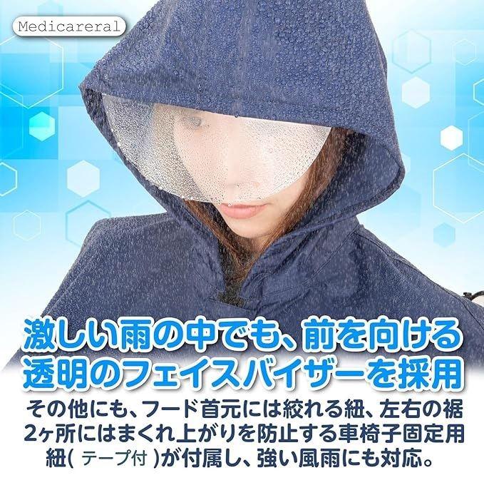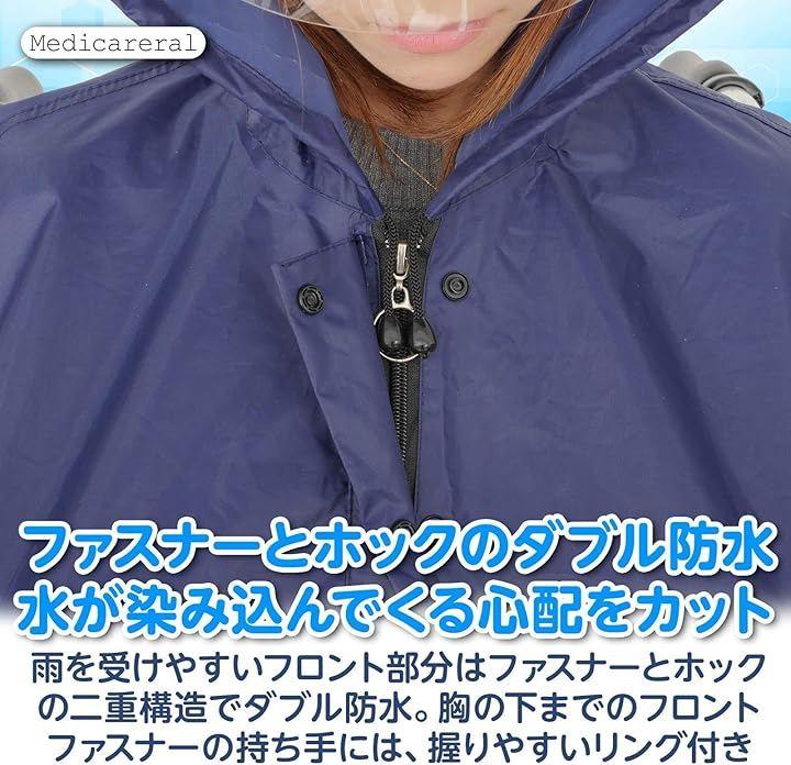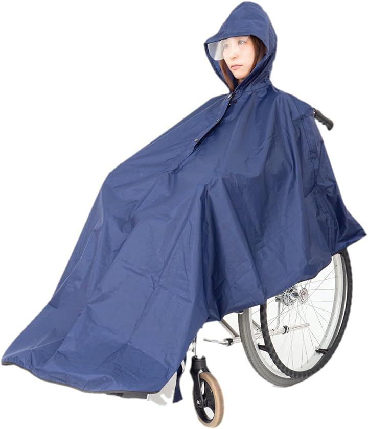 車椅子に座った状態のまま、上から被るだけの着脱容易なポンチョ型レインコートです。