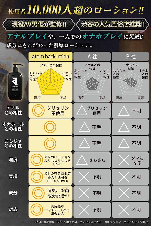 【現役AV男優監修】【渋谷の人気店でも愛用】使用者10000人OVERのローションを彼女とのセックス、男性ひとりでのオナホでのオナニーをご自宅で楽しんで頂ける日本製ローションです。アナルや一人でのオナホプレイにも最適!成分にもこだわった濃厚ろーしょん。オナホール内部の構造をより敏感に楽しめてオナホールとの相性抜群なローションです。アナニー用としてもおススメです。 atom lotionは企画製造すべて日本製で特濃・大容量の500gですのでローションを1度にたっぷり使用して、より気持ち良くなれるローションです。オナホと使用する際もたっぷり使用して頂くと気持ち良さ倍増ですので是非オナホでのオナニーにも使用してください~アナル用としても使用頂けるように粘度も濃厚になっているので、男性のアナニー、女性とのセックス、女性とのアナルセックス、前立腺マッサージ、前立腺、お尻用、あなるにもメンズにも相性の良いろーしょんです。 アナルとの相性にこだわって「グリセリン不使用」なのでお腹がゆるくなりません。セックス、オナホ、アナニー全てに万能なろーしょんです。オナホのローションとして使用しても◎、パートナーと使用しても◎なローションです。セックスの相性も◎ 無味、無臭、無着色のストレートタイプのローションで、除菌成分配合、洗い不要 潤い 乾かない ベタつかない 遅乾 ねっとりアダルトろーしょんです。ボトルデザインにエロさが無く部屋に置いていてもアダルトな感じの無いオシャレなオナホローションです。パソコンの横にオナホ-ル用として置いても自然です。ベットの横に置いて置いてもオシャレなローションです。 【消臭、除菌成分配合】日本製で消臭、除菌成分配合なので使用後も綺麗で清潔!デリケートなアナルにも安心。前立腺マッサージ、前立腺などのメンズのお尻用、あなる、アナル用マッサージにも喜ばれています。