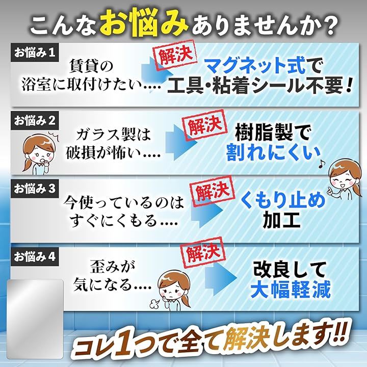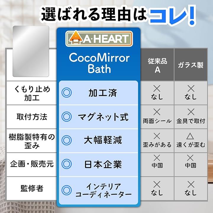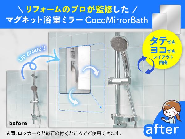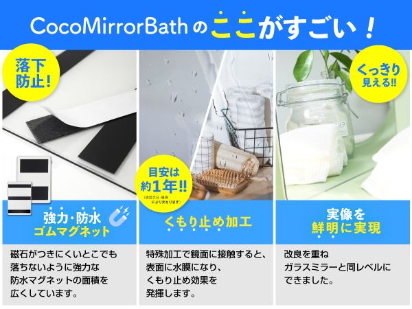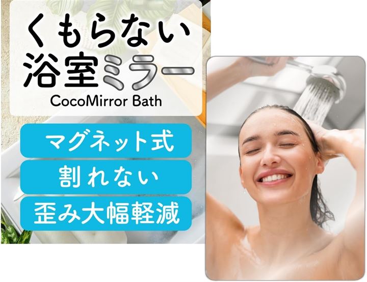 「商品基本仕様」ココミラーCocoMirror購入のお客様の要望におこたえして、浴室専用の割れない鏡、CocoMirror Bath を開発いたしました。