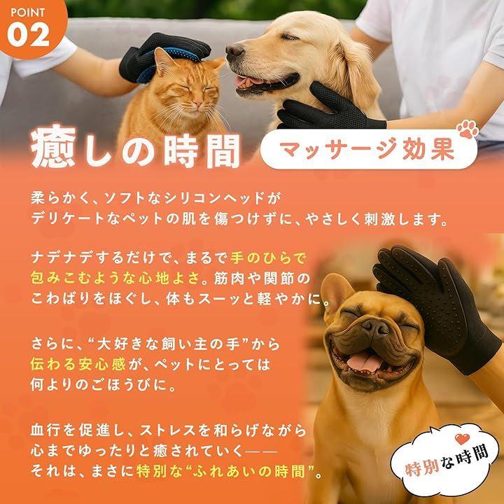 さらに、一般的なペット用グローブは硬いブラシ素材でペットが嫌がることもありますが、NADENADEは肌あたりのやさしい柔軟TPR素材を採用。