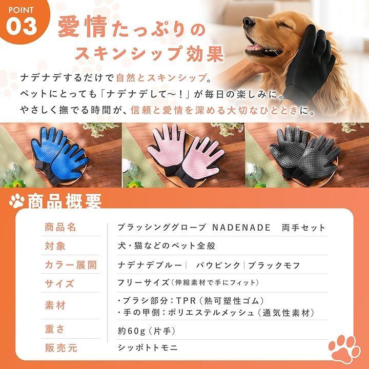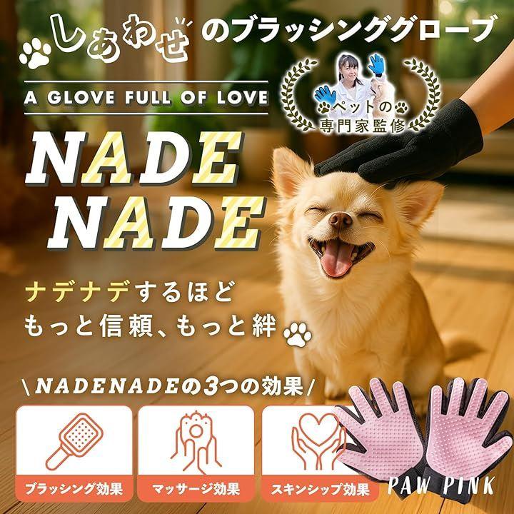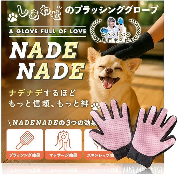 「ブラッシンググローブ NADENADRE ナデナデ」 NADENADEは、「ペットともっと優しく、もっと楽しくふれあいたい」という飼い主さんの声から生まれた両手セットのブラッシンググローブです。