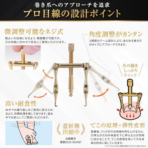 【巻き爪のプロ監修】累計3万人の施術実績のある巻き爪専門院「東京巻き爪センター」の院長が監修した本格矯正器具。自宅でプロレベルのケアが可能です。?【エビデンスに基づく設計】学術研究をもとに設計された矯正プロセスにより、温浴軟化→乾燥硬化のサイクルで爪をしっかりと形状保持。?【多様な爪タイプに対応する3つの軸穴設計】片側特化型・ノーマル型・ななめ型の3種類の設定で、軽度から重度、片側の巻き爪や変形の強い爪など、さまざまなタイプの巻き爪を矯正できます。?【高耐久・防錆加工】水中での使用にも耐えられる防錆処理を施しており、温浴ケアと組み合わせて使うことができます。?【微調整可能なネジ式】力加減を細かく調整できるネジ式設計で、痛みを最小限に抑えつつ、安全に使用できます。?【充実のセット内容】5種類のアタッチメントであらゆる爪にフィット。専用ゾンデは爪垢取りや器具の装着時に活躍。わかりやすい図解カラー説明書で初心者でも安心。さらにブリキ製の専用ケースで一生物としてご使用いただけます。??【使用上の注意】●重度の巻き爪や爪周辺に炎症、出血がある場合は使用を控え、専門医にご相談ください。●一度の矯正で完治を目指すのではなく、複数回に分けて矯正してください。●過度な矯正は爪割れの原因となるため、適切な力加減で使用してください。●金属アレルギーの方はご使用をお控えください。【ご使用上の注意】 ●本品は軽~中度の巻き爪用です。重度の方、爪周辺に傷・炎症等がある方、金属アレルギーの方はご使用をお控えください。 ●痛みや違和感が生じた場合は直ちに使用を中止し医師にご相談を。 ●最初は短時間(15分程度)から試し、徐々に装着時間を延ばしてください。過度な矯正や無理な装着はおやめください。 ●深爪の場合は爪が2mm程度伸びてからご使用ください。詳細は付属の説明書をご確認ください。[巻き爪 まきづめ マキズメ 陥入爪 爪伸び育 巻き爪保護 テーピング テープ 爪切り ブロック リフト 巻爪 深爪 クリップ かんにゅうそう 爪殺菌ジェル] ?【巻き爪のプロ監修】累計3万人の施術実績のある巻き爪専門院「東京巻き爪センター」の院長が監修した本格矯正器具。自宅でプロレベルのケアが可能です。 ?【エビデンスに基づく設計】学術研究をもとに設計された矯正プロセスにより、温浴軟化→乾燥硬化のサイクルで爪をしっかりと形状保持。?【多様な爪タイプに対応する3つの軸穴設計】片側特化型・ノーマル型・ななめ型の3種類の設定で、軽度から重度、片側の巻き爪や変形の強い爪など、さまざまなタイプの巻き爪を矯正できます。 ?【高耐久・防錆加工】水中での使用にも耐えられる防錆処理を施しており、温浴ケアと組み合わせて使うことができます。?【微調整可能なネジ式】力加減を細かく調整できるネジ式設計で、痛みを最小限に抑えつつ、安全に使用できます。 ?【充実のセット内容】5種類のアタッチメントであらゆる爪にフィット。専用ゾンデは爪垢取りや器具の装着時に活躍。わかりやすい図解カラー説明書で初心者でも安心。さらにブリキ製の専用ケースで一生物としてご使用いただけます。 ??【使用上の注意】●重度の巻き爪や爪周辺に炎症、出血がある場合は使用を控え、専門医にご相談ください。●一度の矯正で完治を目指すのではなく、複数回に分けて矯正してください。●過度な矯正は爪割れの原因となるため、適切な力加減で使用してください。●金属アレルギーの方はご使用をお控えください。 【ご使用上の注意】 ●本品は軽~中度の巻き爪用です。重度の方、爪周辺に傷・炎症等がある方、金属アレルギーの方はご使用をお控えください。 ●痛みや違和感が生じた場合は直ちに使用を中止し医師にご相談を。 ●最初は短時間(15分程度)から試し、徐々に装着時間を延ばしてください。過度な矯正や無理な装着はおやめください。 ●深爪の場合は爪が2mm程度伸びてからご使用ください。詳細は付属の説明書をご確認ください。 (#lf)(#lf)(#lf)商品購入前に、ストア紹介ページをご確認ください。