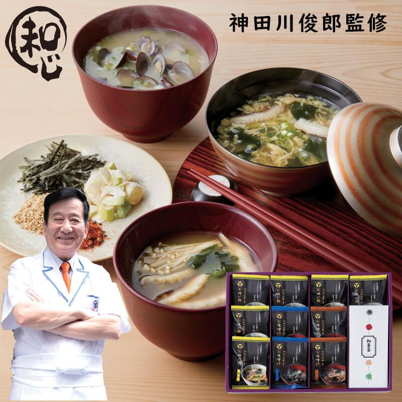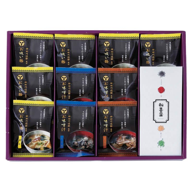 しじみフリーズドライ味噌汁、きのこフリーズ ドライ味噌汁×各2、玉子フリーズドライお吸い物×6、 刻み海苔0.3g、白煎りごま1g、七味0.2g、ネギホール0.25g×各4