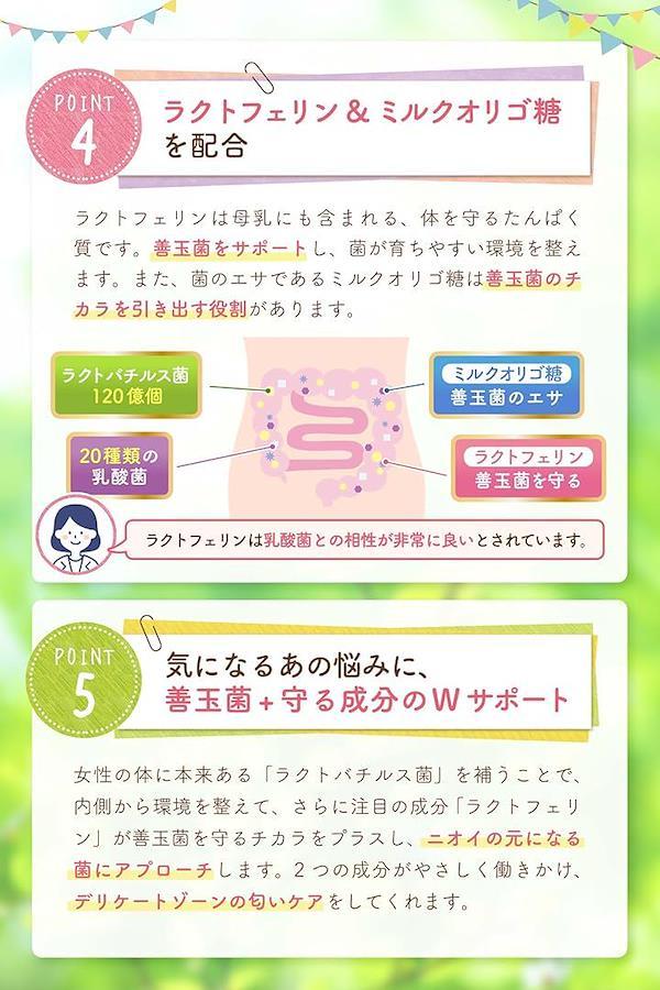 「デリケートゾーンの匂いケアにもアプローチ」 善玉菌をサポートするラクトフェリンと20種類の乳酸菌の働きで、ニオイの元にやさしくアプローチ。