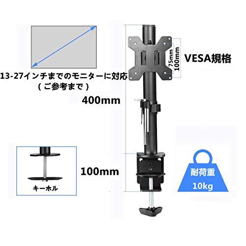 互換性:アーム抜きの液晶モニターを1台設置できるモニターアームです。耐荷重:10kg?対応モニターサイズ:13-27インチ?VESA規格:75×75mm、100×100mm?固定方式:クランプ式角度調節:±45°前後傾斜?±45°左右回転?360°回転。モニター位置を上下調節可能!二種類の取り付け方法:机でグロメット用の穴があってもなくても、どちらも利用可能です。ケーブル管理:ケーブルガイドが付き、デスクをきれいにします!空間が節約でき、素晴らしい視覚体験をさせます。パッケージの内容:日本語説明書×1、取り付け部品×1。