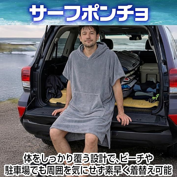 「タオルポンチョ 多用途」 タオル一体型のため、ビーチ・駐車場・キャンプ・車中泊など多用途に対応。