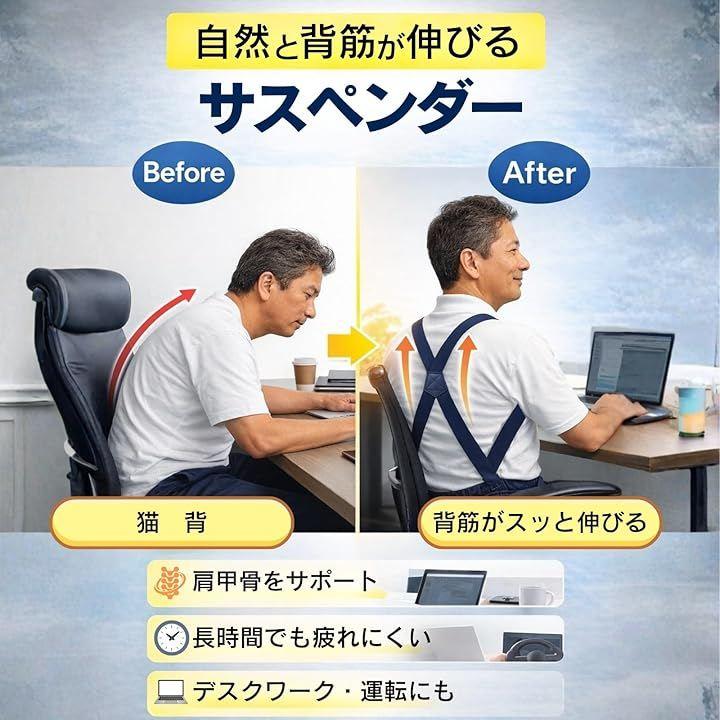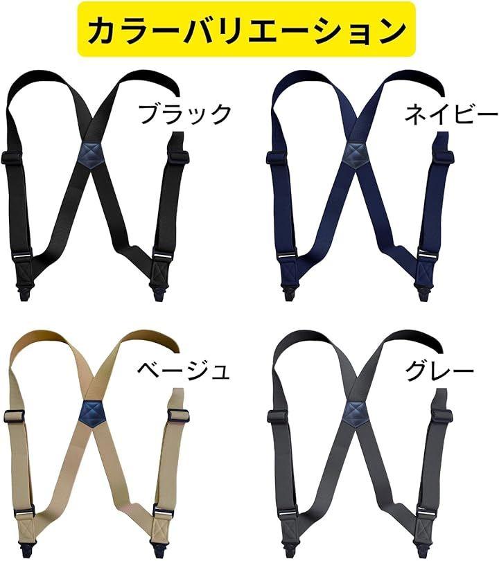 また、X型やY型のサスペンダーに比べて肩への負担が少なく、快適なフィット感を提供します。