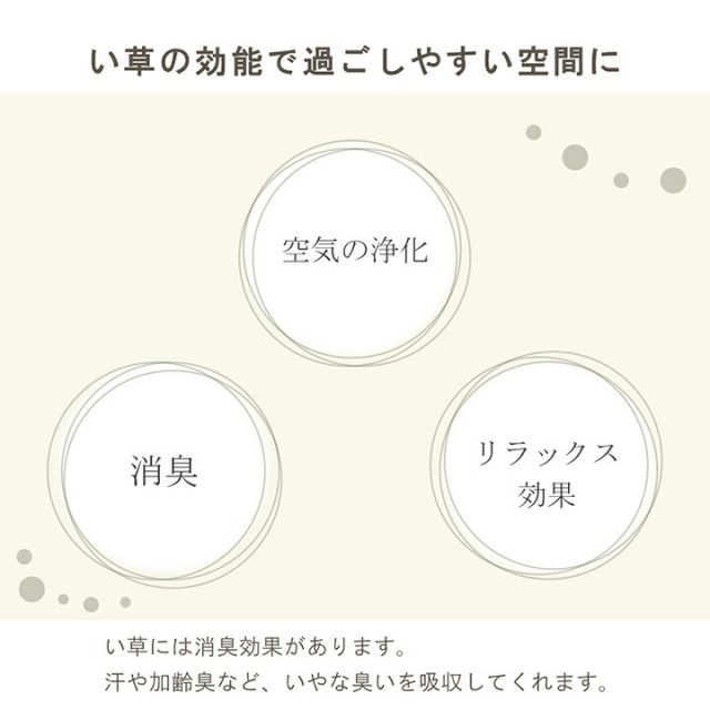 健康志向や地球環境保全の観点から、今また日本固有の文化「畳」が見直されてきています。畳文化を守り継承していく為には、原料であるい草の産業を残す必要があります。私たちはい草メーカーとして、い草のインテリアを通してい草産業の継承へ取り組んでいます。い草には空気の自然浄化作用、湿度の調節作用、リラックス効果などがあります。通常染土されたものが敷物につかわれますが、無洗土にすることで素材そのままを取り入れることが出来ます。素材を無駄にしないで使い切る取り組みを行っています。通常敷物に使用されるサイズは約90cm以上のものが多く、それ以下サイズのものは廃棄処分になります。廃棄を減らして出来る限り製品化し、畳文化の源であるい草産業の維持に貢献しています。い草をいいところはそのままに、手軽にお部屋のインテリアとして使用できます。