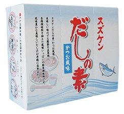 スズケンだしの素(かつお風味)は、おいしい味のでる鰹節を主原料に、各種調味料を加えた天然風味豊かな粉末調味料です。