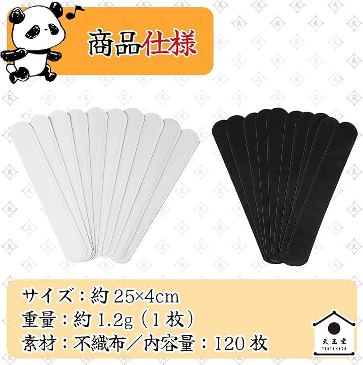 「商品スペック」サイズ:約25x4cm、重量:約1.2g(1枚あたり)、素材:不織布、カラー:ホワイト、内容量:120枚入り。