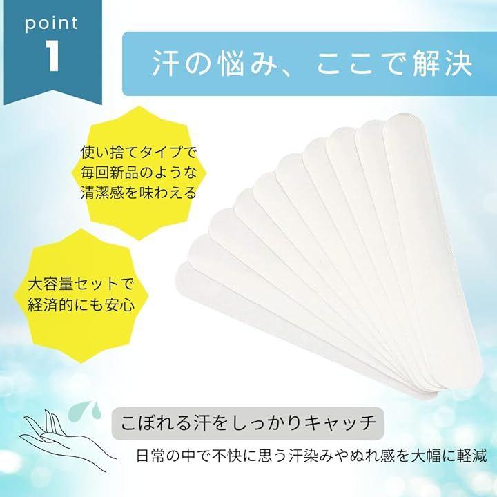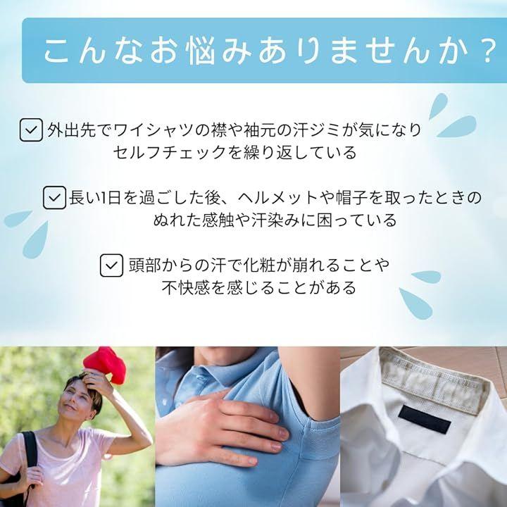 「汗の悩み、ここで解決」帽子の額部分やワイシャツの襟・袖元からこぼれる汗をしっかりキャッチする120枚大容量の使い捨て汗取りパッド。