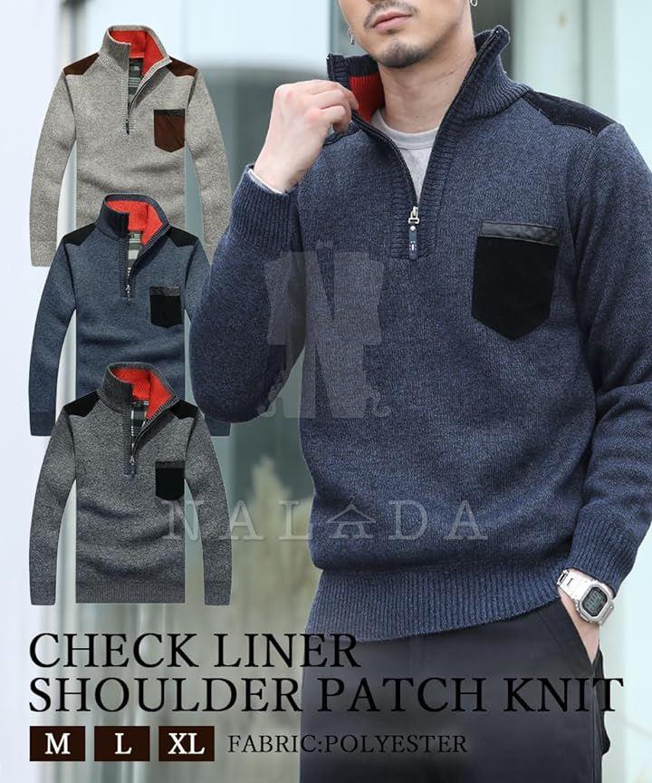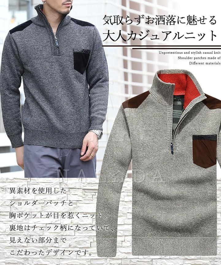 異素材を使用したショルダーパッチと胸ポケットが目を惹くニット。