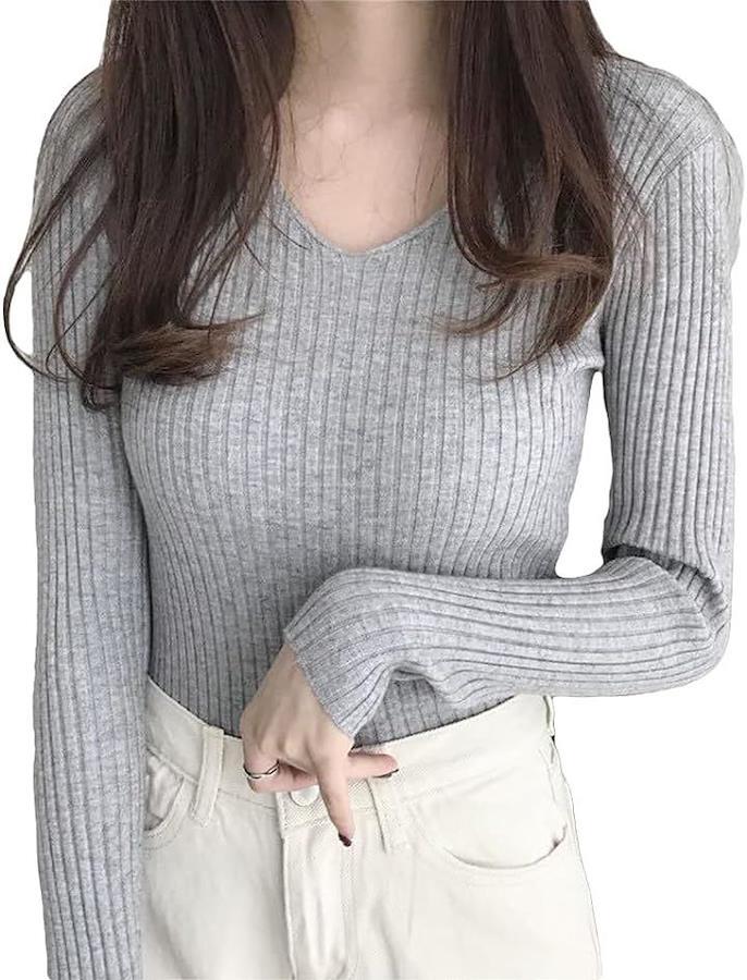Vネックとリブニットの組み合わせで痩せ見えする長袖トップスです。