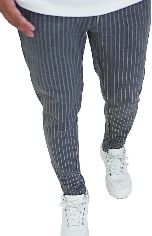 こちらをコンセプトとしてスリムなデザインで履きまわしやすいメンズスウェットパンツを、タイトシルエットにしたストライプパンツ。