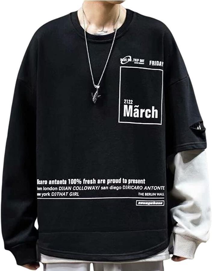 v「韓国風トレンドプルオーバー」 韓国風トレンドプルオーバーが登場。全面のプリントデザインだけでなく、右側の袖部分はフェイクレイヤードになっており、数ある他のメンズトレーナーとは違いこれ一枚でオシャレなコーデが完成します。