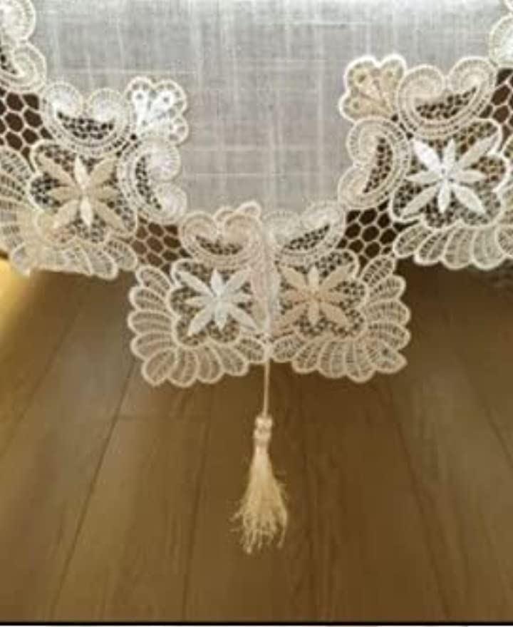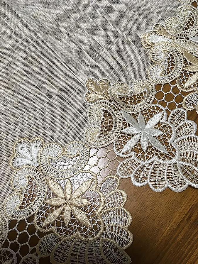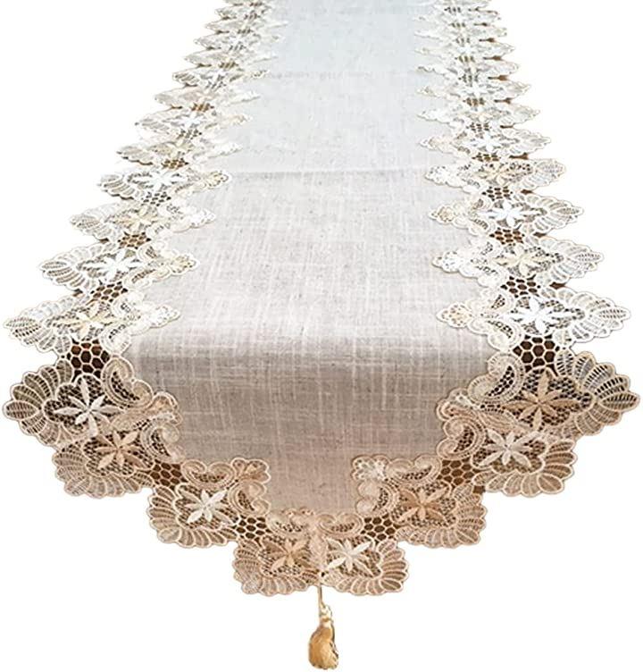 ・「特徴」美しいヨーロピアンレースの縁取りとタッセル付きのテーブルランナー