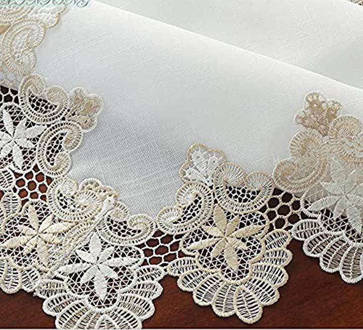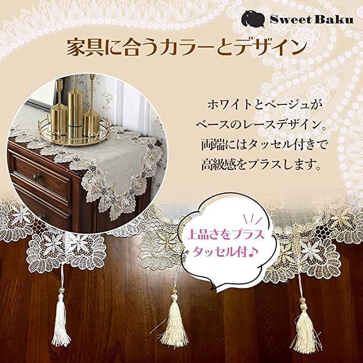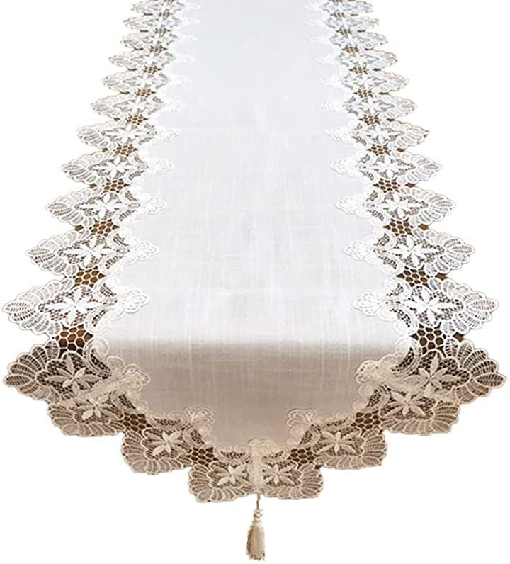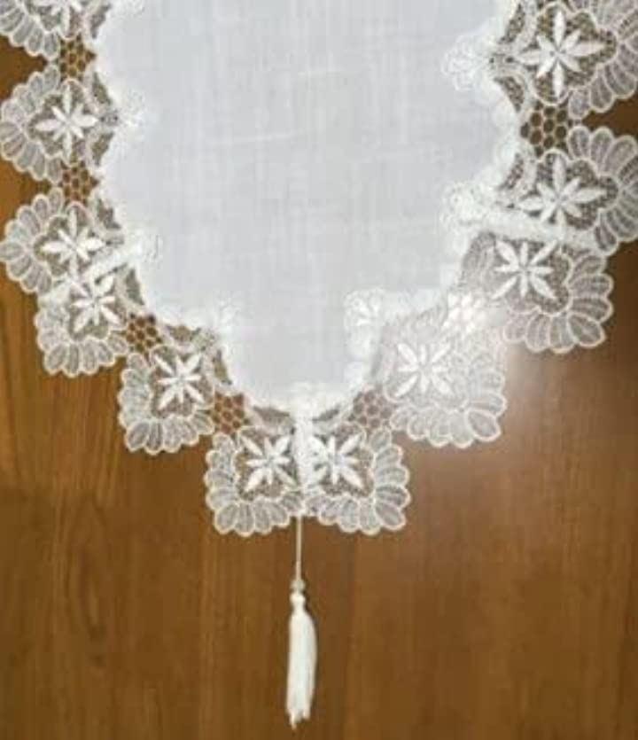 ・「特徴」美しいヨーロピアンレースの縁取りとタッセル付きのテーブルランナー