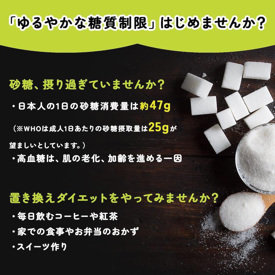 糖類ゼロ、カロリーゼロなので、砂糖とは違い体内で分解、吸収されず、血糖値にも影響を与えないとされています。糖質制限をされている方、カロリー制限をされている方も安心してご使用いただけます。
