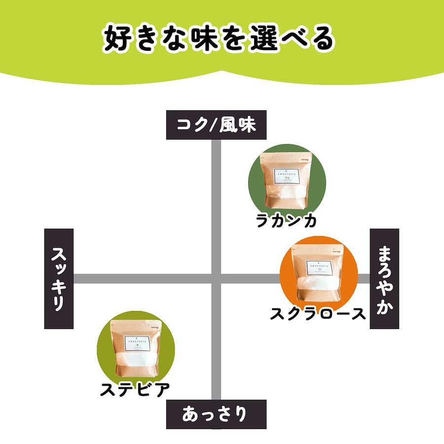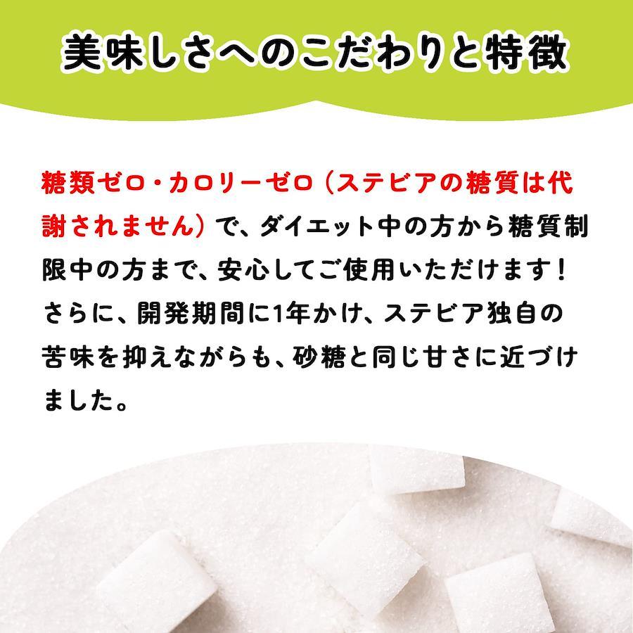 ステビアの雑味を独自ブレンドで程よく効かせてあるので、料理の旨味を引き立てます。またスッキリとした甘さなので紅茶やヨーグルトにも合います。