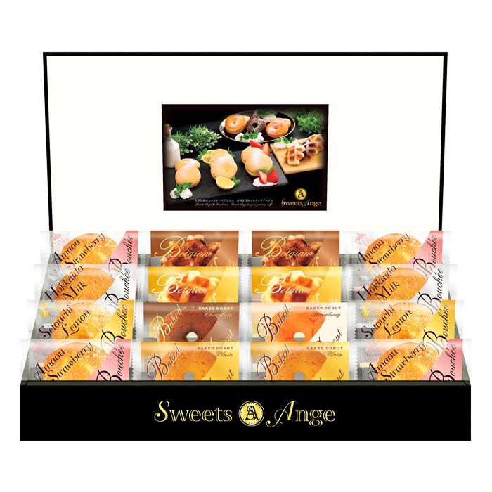 ベルギーワッフル(プレーン・ショコラ)、ベイクドドーナツ(プレーン)、ブッセ(北海道ミルク・瀬戸内レモン)×各2、ベイクドドーナツ(ショコラ・ストロベリー)×各1、ブッセ(あまおう苺)×4【卵、乳、小麦】