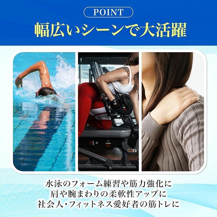 「幅広いシーンで大活躍」水泳のフォーム練習や筋力強化に/肩や腕まわりの柔軟性アップに/小中学生のスイミング練習に/社会人・フィットネス愛好者の筋トレに/出張先や自宅でのトレーニング補助に