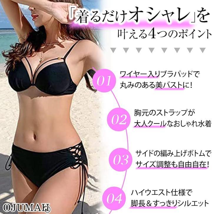 胸元のストラップ使いや、編み上げのボトムスが目を引くスタイリッシュでかっこいいビキニ上下セットです。