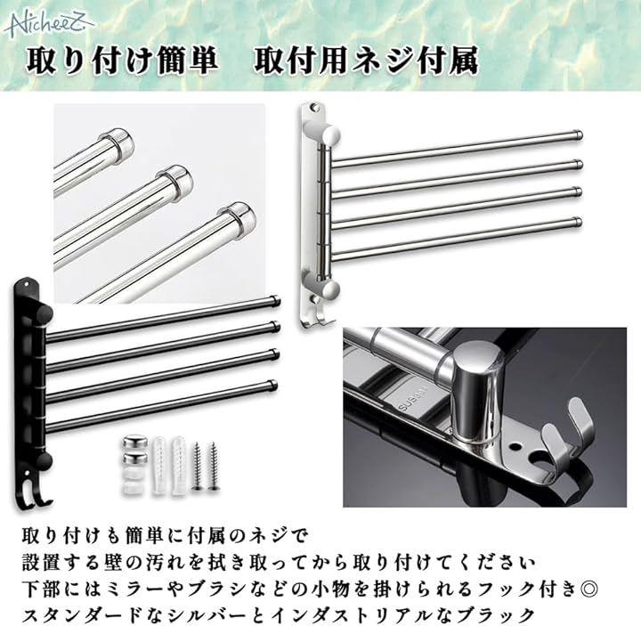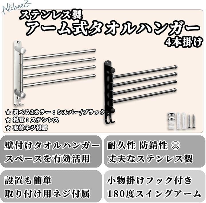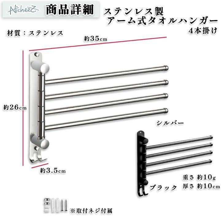 「商品内容」 ステンレス製アーム式タオルハンガー(4本掛け) 材質:ステンレス カラー:シルバー/ブラック サイズ:縦/約26cm 横/約35cm 取り付けプレート幅/約3.5cm 取付用ネジ付属