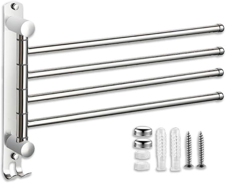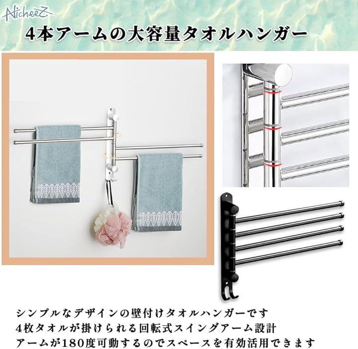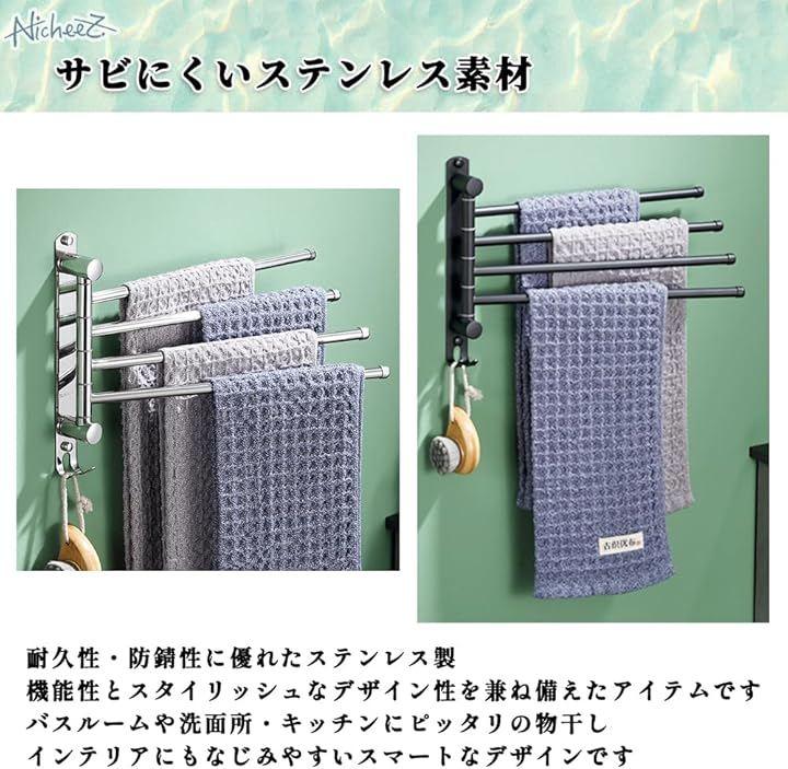4枚タオルが掛けられる回転式スイングアーム設計。