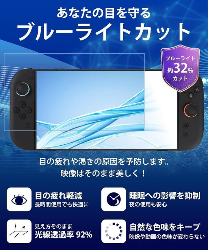 高透過ガラス/選べる3タイプ:Switch2専用の高透過ガラスフィルムで、ゲーム映像の美しさをそのまま再現。
