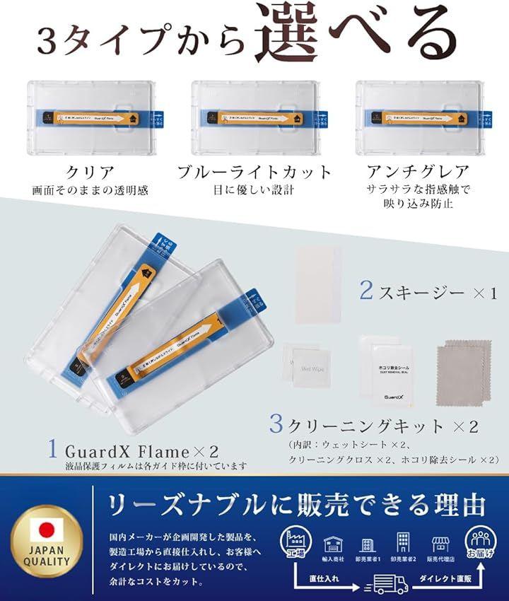 セット内容:液晶保護フィルム x 2枚、GuardX Frame(ガイド枠)x2個、スキージー(ヘラ)x1個、クリーニングクロスx2枚、ウェットシートx2枚、ホコリ除去シールx2枚。