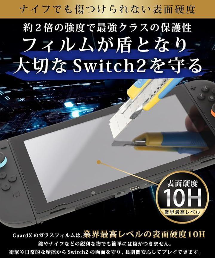 10H硬度を誇る強化ガラスを採用し、日常の擦れや衝撃、落下からSwitch2の液晶画面をしっかり保護します。
