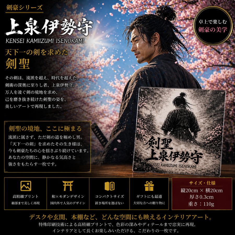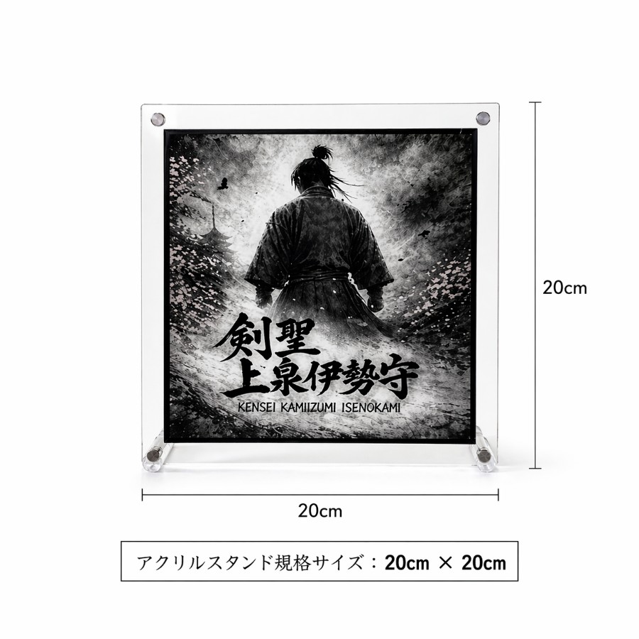 商品:卓上スタンドデザイン:上泉伊勢守サイズ:縦20cm × 横20cm × 厚み0.3cm(印刷面 17cm × 17cm)重量:約110g素材:樹脂素材※仕様により異なる場合があります。印刷:インクジェット印刷生産国:日本