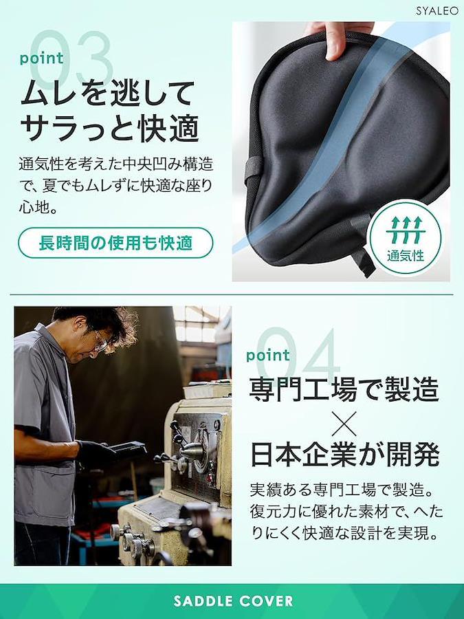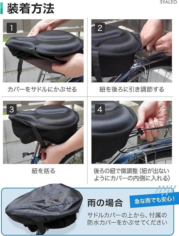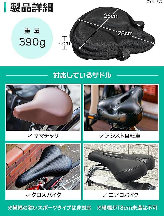 「商品詳細」〇サイズ:縦/28cm、横/26cm、厚さ/4cm(*横幅の狭いスポーツタイプは非対応*横幅が18cm未満は不可) 〇対応サドル:ママチャリ、アシスト自転車、クロスバイク、エアロバイクなど 〇重量:390g 〇セット内容:極厚サドルカバー、防水カバー、説明書、解説動画 〇ブランド:SYALEO