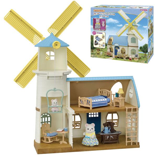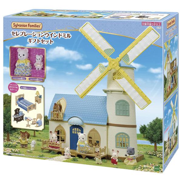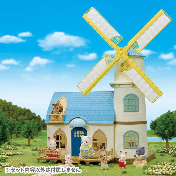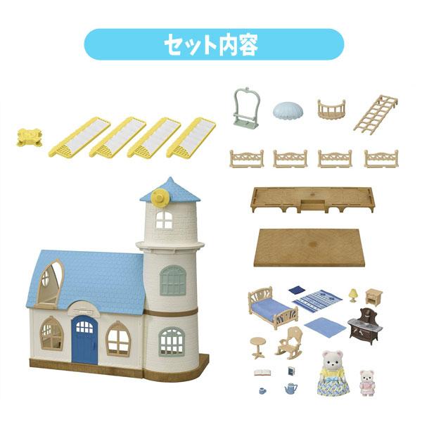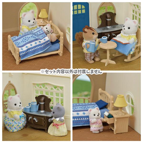 【セット内容】本体、2階床、2階バルコニー、はしご、ウッドデッキ、ウッドデッキ柵×4、羽根軸、羽根×4、風車ユニット、ゴンドラ、ひも、オーニング、シロクマのお母さん、シロクマの赤ちゃん、キッチンストーブ、ベッド、マットレス、まくら、かけぶとん、サイドチェスト、引き出し、ロッキングチェア、サイドテーブル、シェードランプ、日記帳、本、ブランケット、ポット、ふた、マグカップ