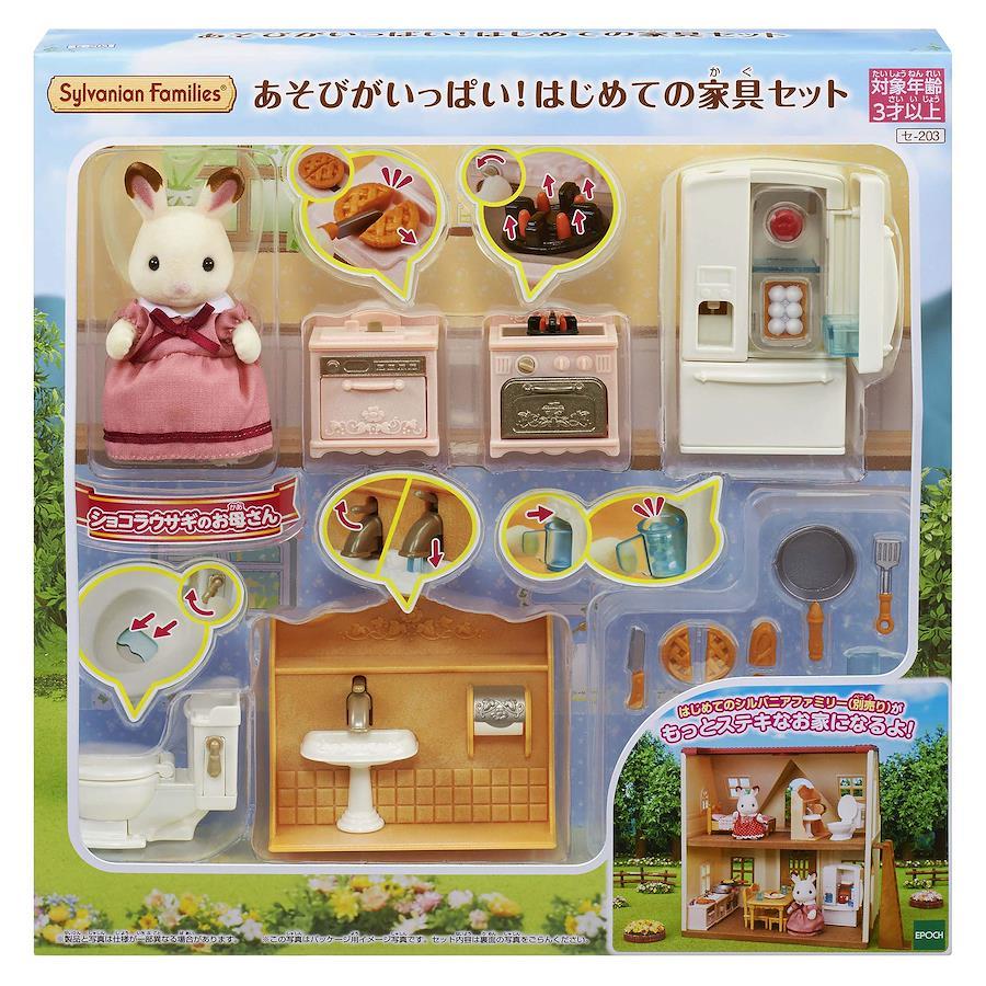 ショコラウサギのお母さん人形と、動くしかけつきの家具のセットです。それぞれの家具はまるで本物のように動くので、ごっこ遊びがいっそう楽しくなります。コンロはつまみを回すと炎パーツが現れます。クッキングテーブルにアップルパイやバゲットを置いて、包丁でカットできます。冷蔵庫の製氷口にコップをいれると、氷パーツが落ちてきます。洗面台のシンクはレバーを動かすと水パーツが出ます。トイレのレバーを動かすと水パーツが流れます。別売りの「はじめてのシルバニアファミリー」と一緒に遊ぶと、ごっこ遊びが更に楽しくなります。【セット内容】ショコラウサギのお母さん、コンロ、クッキングテーブル、引き出し、冷蔵庫、冷凍室、トレイ、洗面台、トイレ、アップルパイ(ハーフ)×2、バゲット(ハーフ)×2、包丁、フライパン、フライ返しホットケーキ、小麦粉、たまご、牛乳、りんご、コップ×3、氷×3(パーツ総数:27個)(.co.jpより) (C)EPOCH 主な原産国:中国 対象年齢 :3才以上 ショコラウサギのお母さん人形と、動くしかけつきの家具のセットです。 それぞれの家具はまるで本物のように動くので、ごっこ遊びがいっそう楽しくなります。